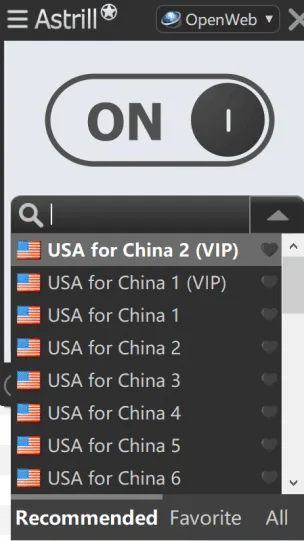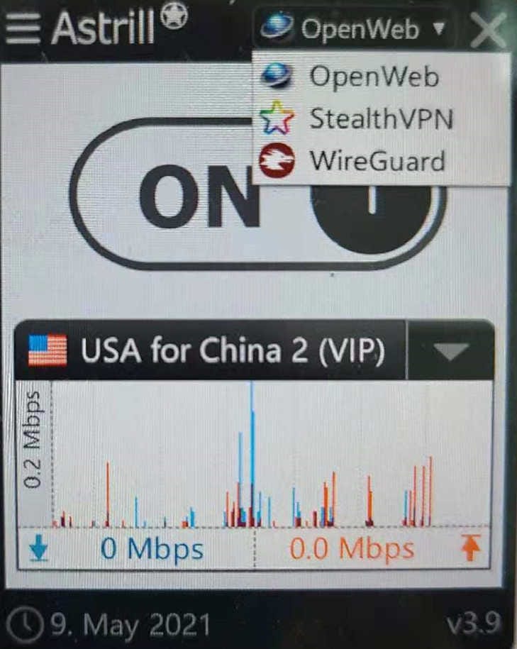 Astrill allows you to connect via OpenWeb, StealthVPN, and WireGuard. We find WireGuard to be the fastest for reaching websites outside of China.