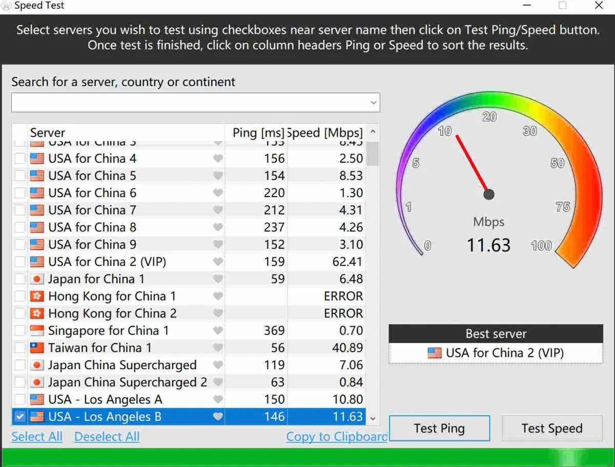 Select the servers you wish to test using the checkboxes near the server’s name. Then click on the Test Ping/Speed button. Once the test is finished, click on the Ping/Speed column headers to sort the results.