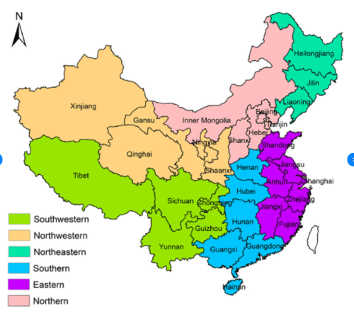 Northeast China (orange) is a separate section due to its history as an industrial region during Japanese rule. Today, it is economically behind the other coastal regions and is considered a rust belt.