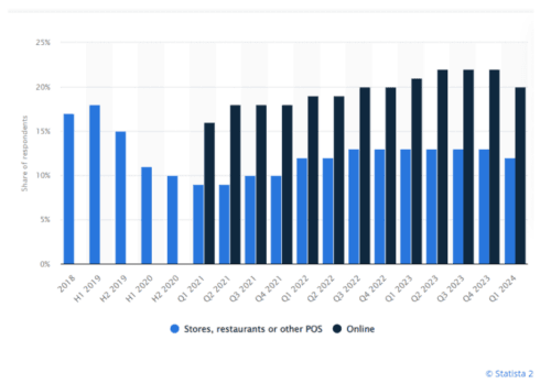 As you can see from the above, the company has lost market share in terms of its usage in stores and restaurants, while its usage online has remained consistent.
