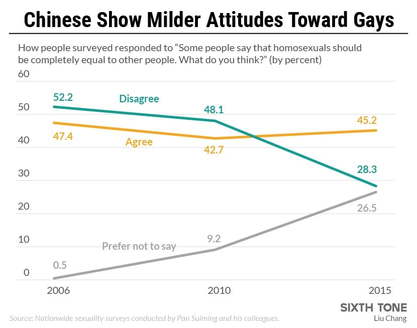 That said, aside from the financial gain that comes with successfully reaching this overlooked group, now is probably the best time to attempt such efforts in China. Why? Because, the populace is more aware of the presence of Queer individuals and attitudes are the mildest they’ve ever been. Between 2006 and 2015, Pan Suiming, a scholar of sexuality, surveyed the Chinese people 3 times asking the question “Some people say that homosexuals should be completely equal to other people. What do you think?” The results are cause for optimism! While the number of LGBTQ+ supporters stayed about the same, the number of those opposed to equal-rights dropped from 52.2% to 28.3%! Also, the number of those who decided to not state an opinion increased from .5% to 26% showing indication of growing indifference on the topic (which, let’s be real, is better than antagonizing attitudes). In a similar study conducted 4 times between 2000 and 2015, Sulming found an increase in participant willingness to admit to homosexual desire or experience.