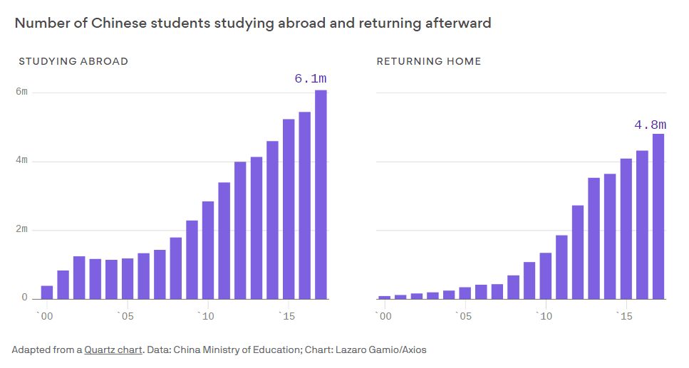 Brought on by China becoming “the factory of the world,” this evolution allowed money to flow from manufacturing to other sectors of the economy (education included) which enabled more Chinese students to start studying abroad.
