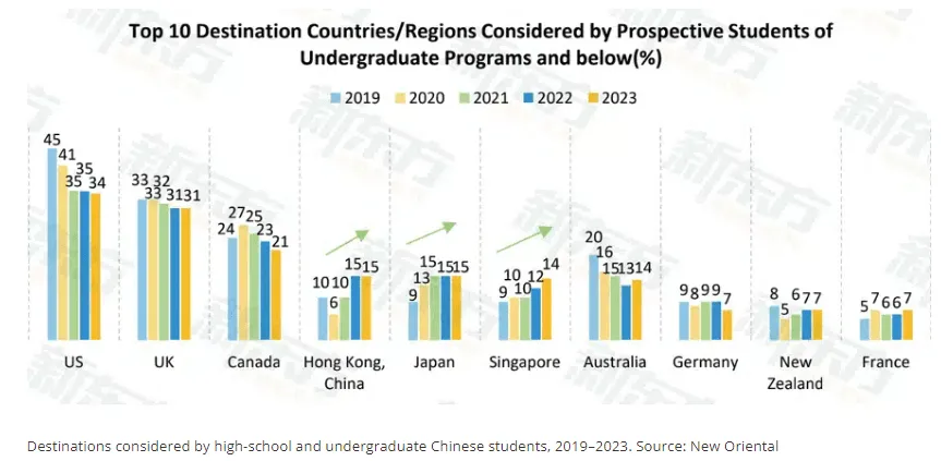 According to ICEF international, Chinese students prefer the following countries the most for private schooling. (This chart contains data for “undergraduate programs and below.”)