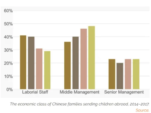 EduFair added to this by pointing out how, between 2014 and 2017, an increasing number of workers in lower positions at companies were beginning to send their children abroad to study, and these individuals are more likely to be living in lower-tier cities.