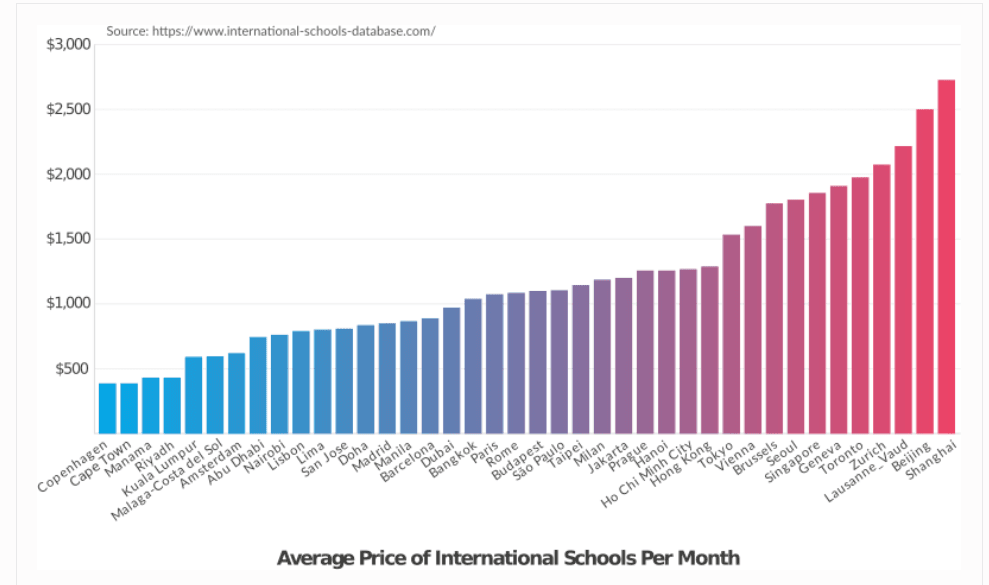 The chart below is a few years old (2018), but it expresses the differences in the cost of international schools (monthly fees).