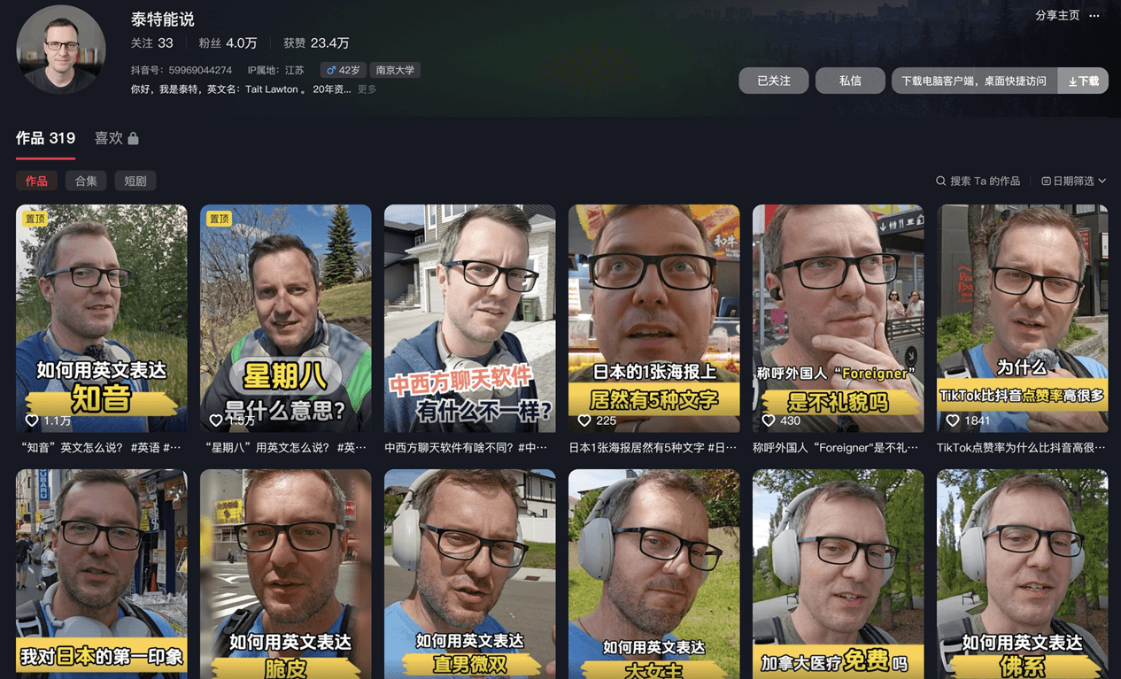 Das ist unser eigener Douyin Kanal, “泰特能说” , von unserem Gründer Tait; Nur ein Post
