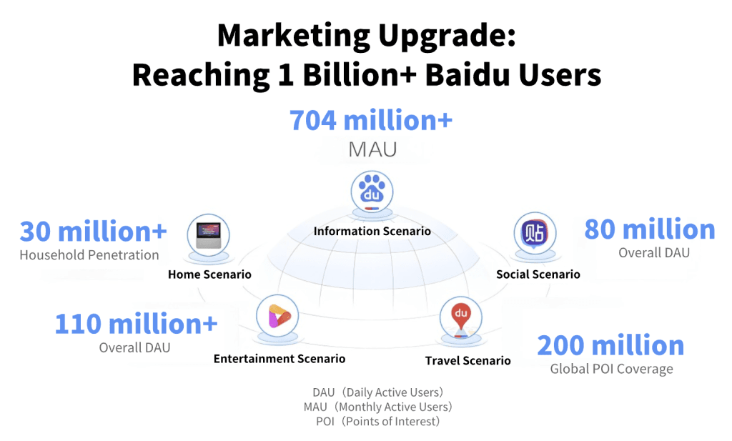 Según el Baidu Marketing Playbook 2025 y el Overseas Tourism Board Marketing Playbook, la app de Baidu cuenta actualmente con más de 704 millones de usuarios activos mensuales (MAU), mientras que el ecosistema completo de Baidu alcanza al 97,5 % de la población internauta en China.