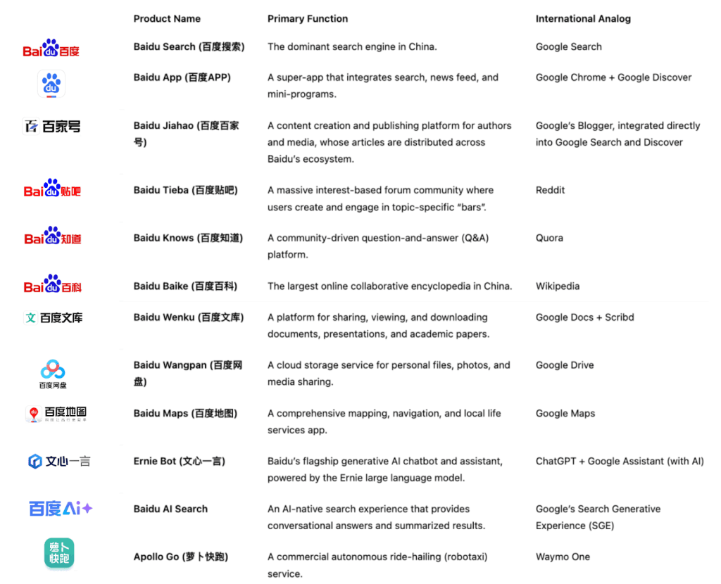 La figura a continuación muestra varios de los productos principales del ecosistema de Baidu, sus funciones y productos aproximadamente comparables en mercados internacionales.