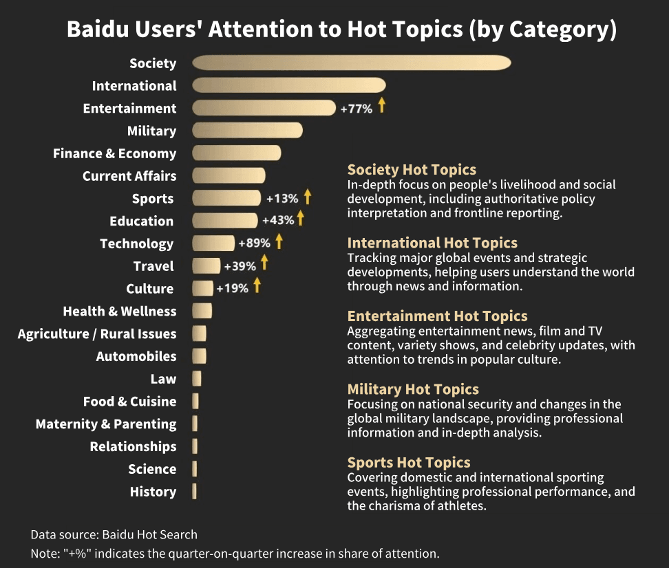 Según el Informe de Tendencias de Búsqueda Baidu H1 2025, publicado conjuntamente por Baidu Hot Search y China CSM Media Research en julio, las búsquedas de los usuarios en Baidu se concentran principalmente en las siguientes categorías: