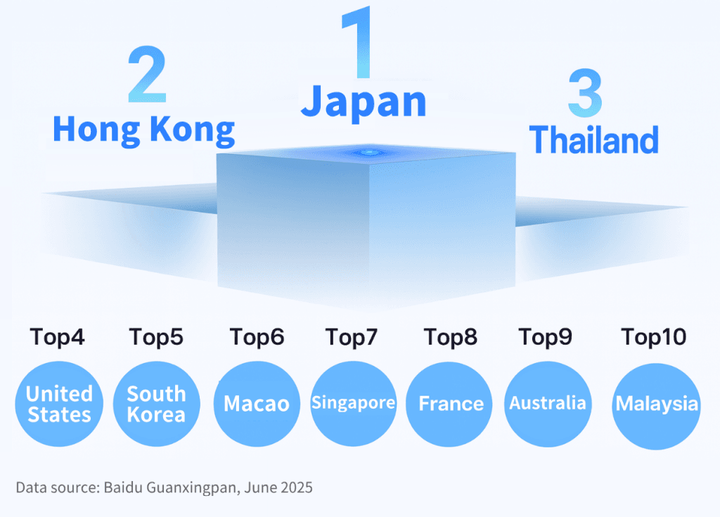 Según Baidu Guanzingpan (la plataforma de análisis e insights de Baidu), los viajeros chinos que salen al extranjero continúan eligiendo principalmente países y regiones asiáticas cercanas como destinos prioritarios.