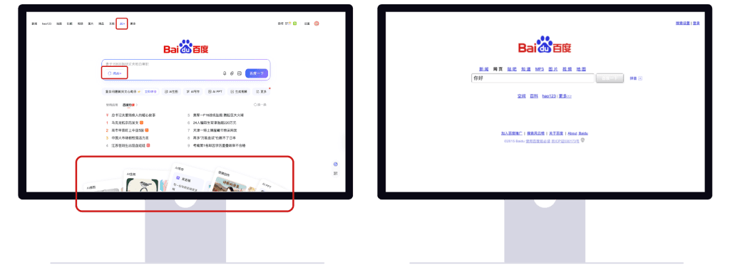 Comparación entre la interfaz actual de búsqueda de Baidu (izq.) y versiones anteriores (der.)