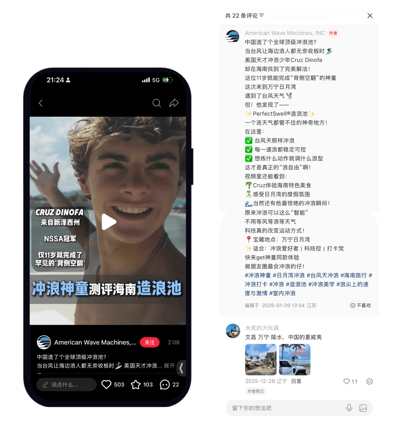 This is a Rednote video we localized for American Wave Machines, a manufacturer of patent protected surf technology. It features New Jersey surfer Cruz Dinofa visiting China to show off his skills using the company’s new wave pool in Hainan, China.