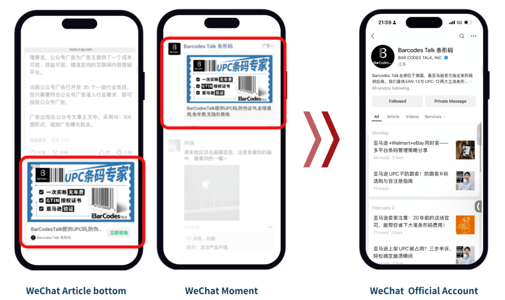 This is an ad we created for Bar Codes Talk, an American company that assists international businesses purchase barcodes more easily. It appeared on WeChat, China’s most popular social messaging app.